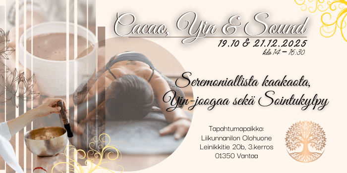 Alkuun uppoudumme Seremoniakaakaon makumaailmaan ja mielikuvaharjoituksiin. Tästä jatkamme rentoutumista Yin-joogan parissa, joka hoitaa ja huoltaa niveliä sekä lihaskudoksia ja sitä kautta koko olemustamme. Vastaanotamme kaakaon vaikutuksen yin-joogan sydämessä ja antaudumme harjoituksen hyvää tekevälle vaikutukselle.